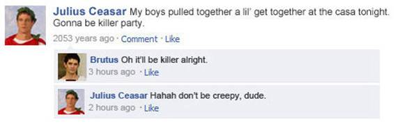 So I think I’m a little late on this, but I’ve been busy and I just, just got to my emails (thanks Sammie!). I think what this little joke is basically telling us is that, if Facebook did indeed exist years ago, it would have actually been…interesting? My friend Todd eating a chicken sandwich isn’t nearly as life-altering as Adam and Eve creating original sin. Unless you’re Todd, who makes a big deal about everything. @IAmBillyShakespeare: Et tu, Brute?