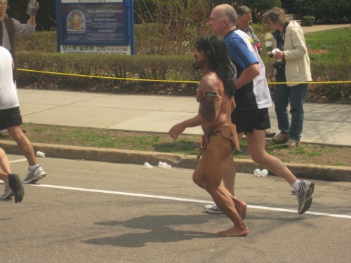 So as you all know I spent last year’s marathon going to work and taking a 2.5 hour lunch break and then leaving early to drink with people who actually ran the race and would be collapsing shortly. I also had one of the greatest encounters of my life with a drunk college student in a hot pink feather boa, who was practically sobbing whilst eating a slice of pizza outside of Pino’s. What could possibly top this???? I’ll give you some hints: Loin cloths, the Freedom Trail and something that looked eerily similar to the Stay Puft Marshmallow Man from Ghostbusters.