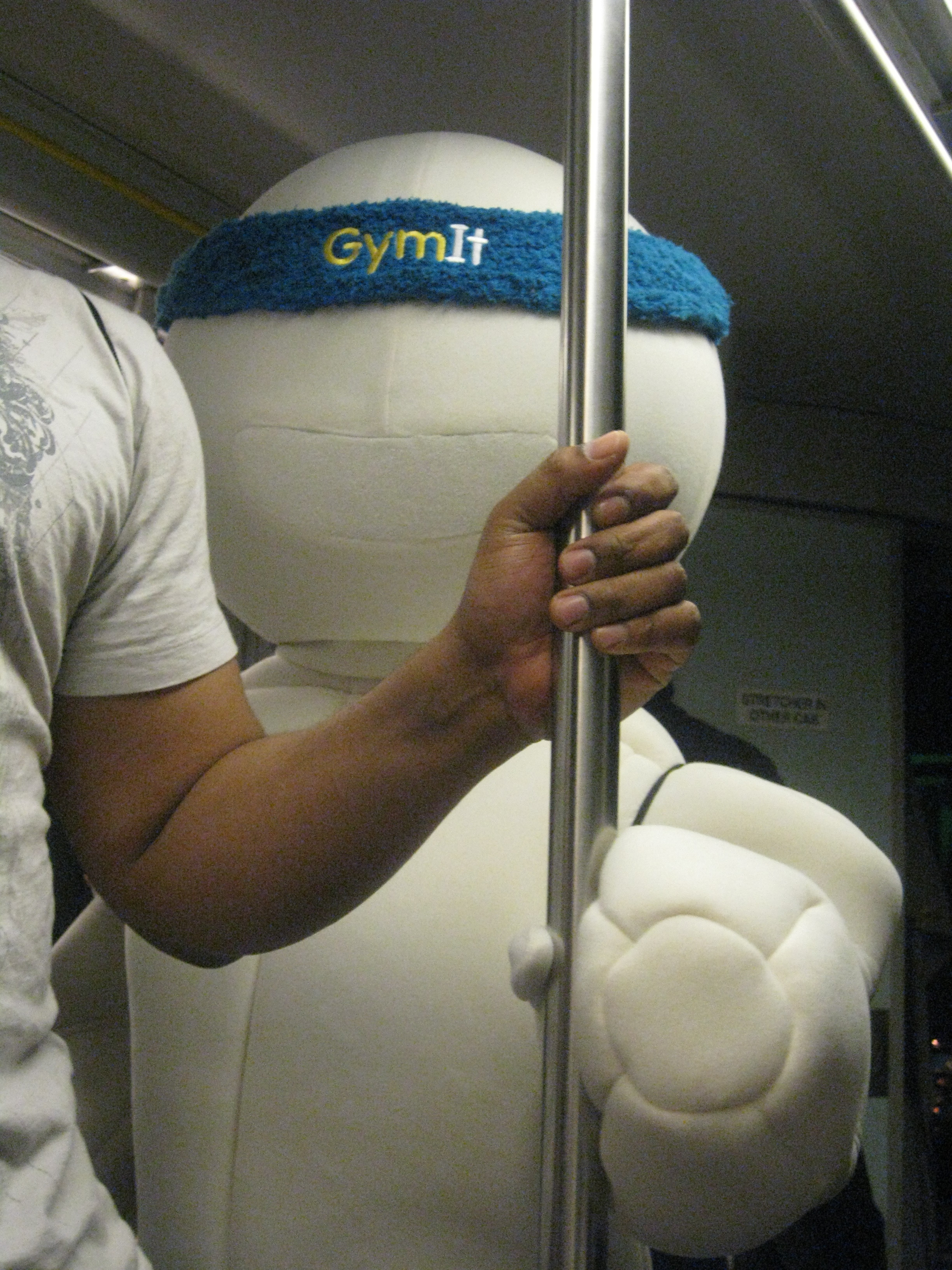 Also on the T, we got to hang with GymIt, a nondescript white puff who is the mascot for a new gym on Comm Ave by BU. GymIt has no eyes, no hands and no feet, but apparently needs a head band because he sweats. He also cannot ride the T by himself, because again, he can’t see. But he can use gym equipment. Am I making myself clear here? GymIt just might be the inspiration for me to name my first born son Gymnasium, calling him Gym. “It’s Gym, with a Y.” I’m so excited about this. I am definitely going to be the worst mother ever.