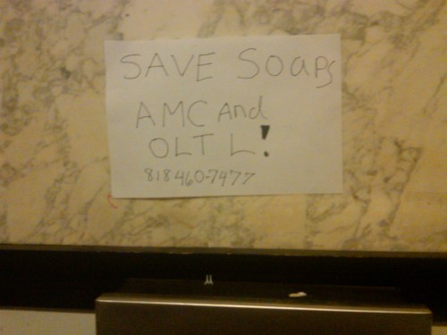 When I first saw this flyer (poster? aggressive propaganda?) taped to the wall in my front entrance earlier this week, I thought it said “Save Seals.” I like seals, so I guess I was fine with it. The acronyms were unintelligible to me, and I didn’t really give it much thought after that. But yesterday, coming home from what was once again an awesome Zumba class, groceries in hand and struggling to find my keys, I gave the sign a second glance. “Save Soaps AMC and OLTL!” I went back and forth about publishing this phone number, but ultimately determined this person is asking for it.