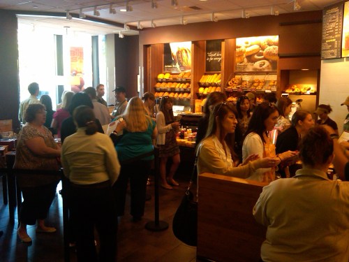 The BSP (Boylston Street Panera) opened with lots of fanfare yesterday, approximately five months after we first spotted the “Coming Soon!” sign in the storefront window. The sun was shining, the birds were chirping, and the line was out the door as servers passed around food samples to loyalists who showed up for the hoopla.