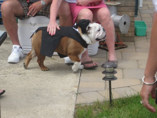 Wearing a dog’s top hat as a fascinator: In great British tradition, I thought it would be adorable at some point in the weekend to wear some kind of great hat. Unfortunately, the only one I could find was part of Kingston the bulldog’s wedding tuxedo costume. After four straight days of drinking, the thought “this will do” crossed my mind, and I wore that hat, or as we say in the UK, the “fascinator,” for an entire game of corn hole. Fascinating.