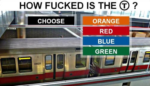 One Joey Brunelle (a.k.a. lead designer and developer of Goose Rock Design, where they “make awesome things”), a Kennebunk, ME native, has started the website How Fucked is the T? (HowFuckedistheT.com) which gives live data on where all four of the MBTA subway lines are at any time of the day, which basically shows that during most of the day the T is late, shut down, broken, sucking at life, etc. This has become my new favorite obsession.