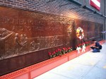 To our right, a memorial to the firefighters and police who lost their lives on 9/11 was encased in the wall of a building beside Ground Zero. About 50 people stood in front of the site, some leaving flowers and flags, some taking pictures, some talking to the handful of reporters who had come down to the site to get a few stories.