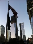 Above us, the new buildings rising from the ashes of destruction were beautiful. Since the sun was setting, the colors of the sky were reflecting in the sides of each building that surrounded us. American flags flew from each one. Walking across the Liberty Street Bridge, we could see into the “Footprints” of the North and South Towers. The water was running, again in preparation for today’s ceremony, water being a beautiful sign of rebirth.