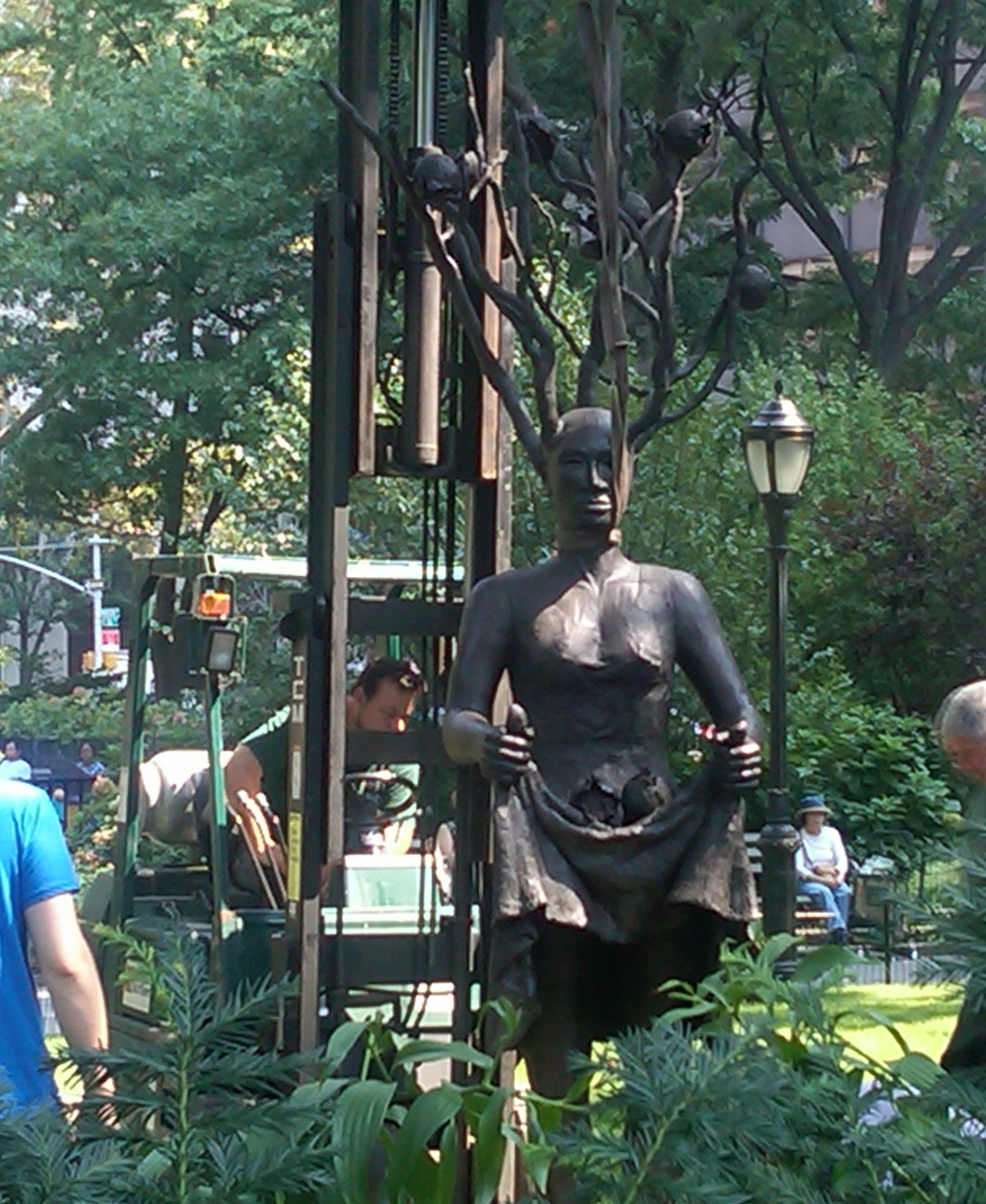 I should have recognized it as a bad omen when the first thing I saw upon entering the park was a team of people trying to remove one the park’s sculptures from the grounds with a forklift. It was a sculpture of a woman (I’m using this term loosely. She had boobs, other than that, it was hard to tell.). And to move her, they had to tie a rope around the top of the sculpture, which just so happened to be her neck. I was somewhat disturb. However, not enough to stop me from taking a picture.
