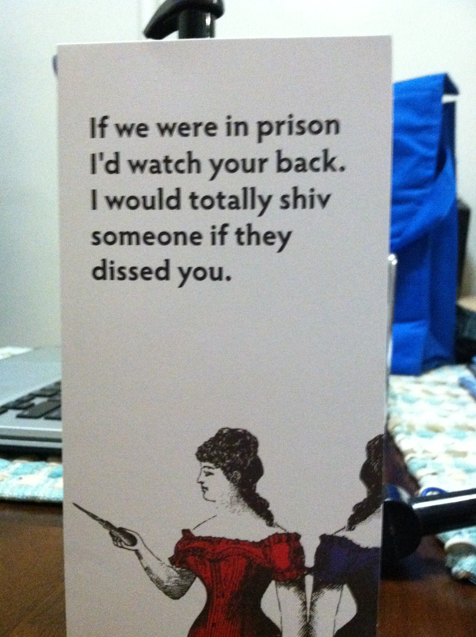 It’s always a good day when you come home to a lovely Valentine’s Day card in your mailbox. It’s also a good day when you find out that someone is willing to shiv anyone who disrespects you. These are the rules of the playground my friends, and they are simple and finite (I also love the Victorian garb; never mess with a bitch in a corset).