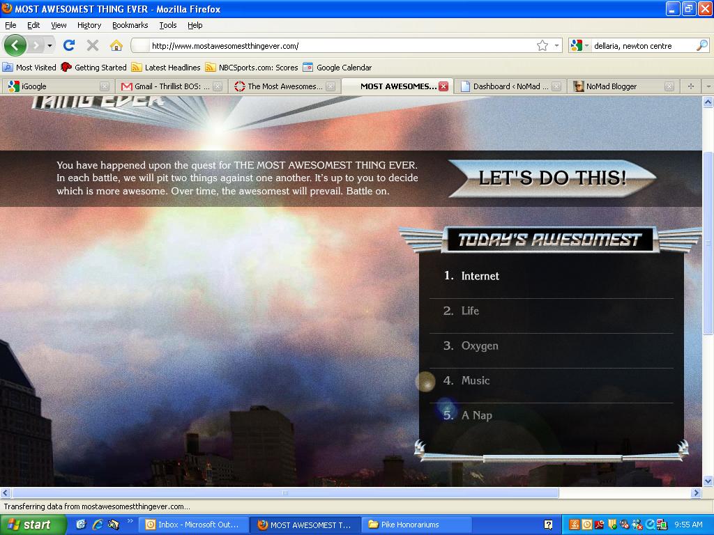 Quite a quest, but it seems they’ve actually put the power in YOUR hands by letting users of their new site (www.mostawesomestthingever.com – how was this domain name not already taken?) choose the more awesome thing between two randomly selected…well, things.